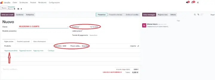 Odoo calcola automaticamente il totale e permette di inviare il documento via email direttamente dalla piattaforma.