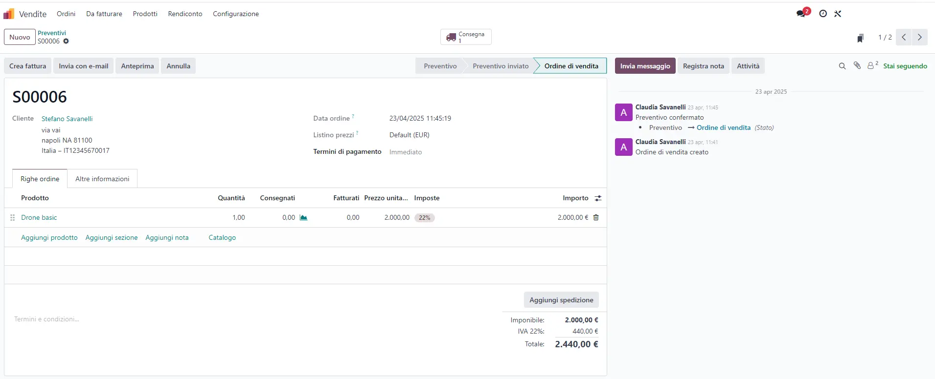 Niente copia-incolla, niente errori. Odoo genera automaticamente i documenti correlati (ordine, fattura, consegna) e aggiorna lo stato del processo. Tutto avviene in modo fluido, all’interno della stessa piattaforma.